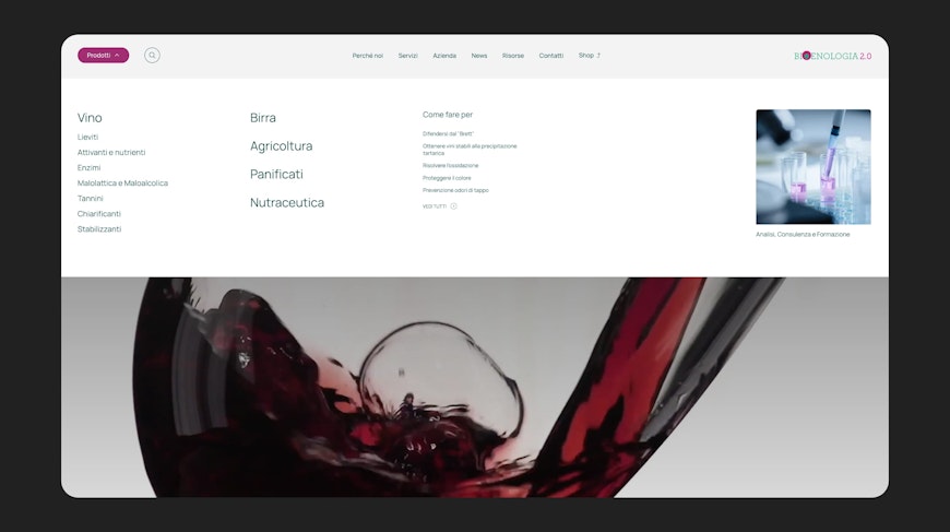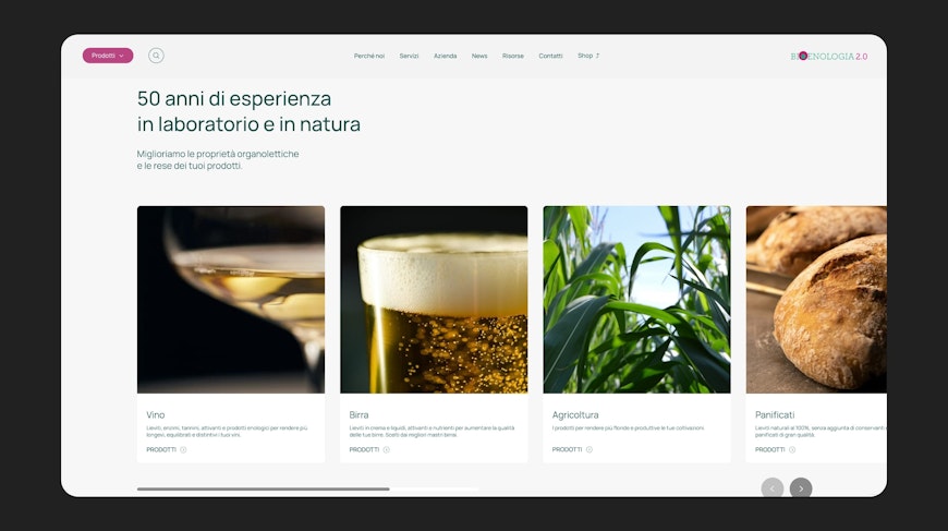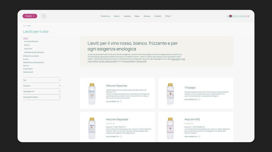 La navigazione è stata progettata per adattarsi alla diversità e profondità delle categorie. Nei settori più articolati, come l’enologia, è stato implementato un sistema avanzato di filtri dinamici, che si aggiornano in base alla selezione e permettono di trovare rapidamente il prodotto giusto per ogni fase, soluzione o tipologia. Nei casi in cui l’offerta si concentri su pochi prodotti, la navigazione si semplifica su racconti di contesto e accessi rapidi alla pagina dell’articolo.