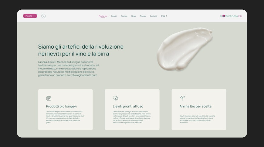 Il nuovo sito restituisce con immediatezza la doppia anima di Bioenologia: naturale e scientifica, tecnica e sensoriale. La palette cromatica è costruita su toni rassicuranti -verde, beige e bianco- evocando autenticità, naturalità e sostenibilità. L’interfaccia è arricchita da icone flat che semplificano la comprensione dei messaggi chiave.