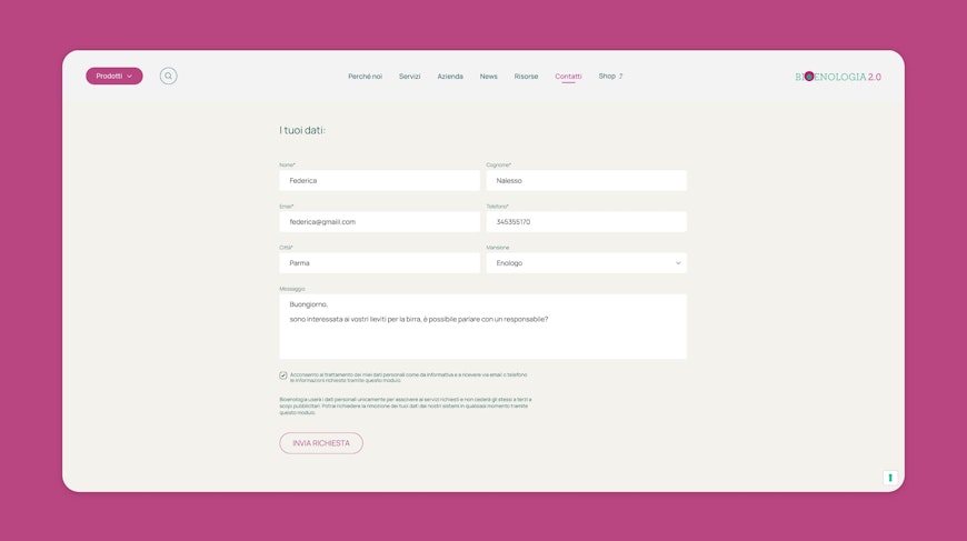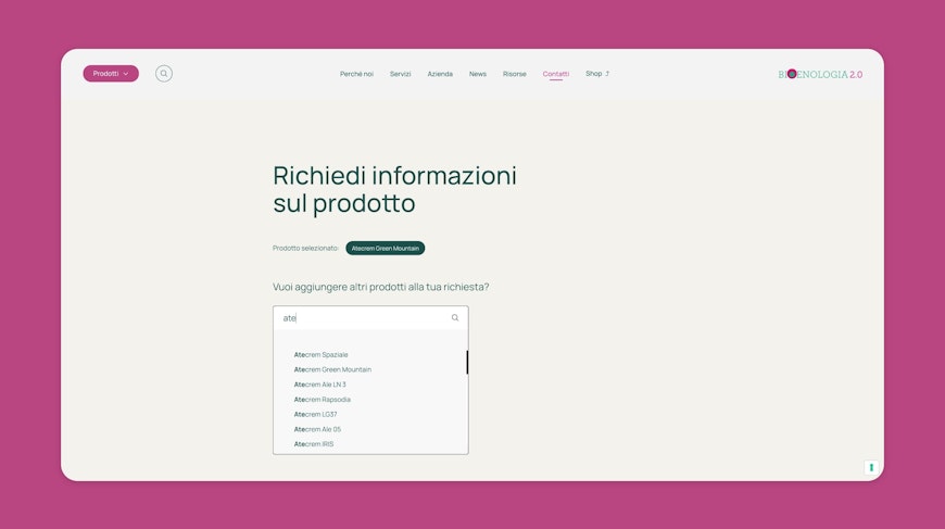 Il nuovo sito integra un modulo di richiesta informazioni progettato per facilitare la conversione per il target di Bioenologia. L’azienda offre prodotti che spesso lavorano in sinergia e questo richiederebbe all’utente la compilazione di più form. Per ovviare questa frizione, è stato costruito un form dinamico multiprodotto con la possibilità di aggiungere rapidamente altri prodotti alla stessa richiesta tramite un campo di ricerca intuitivo che copre l’intero catalogo. Questo permette ai professionisti di ottenere informazioni su più articoli contemporaneamente, in modo tracciato e senza perdite di tempo, mantenendo un’interfaccia chiara e in linea con lo stile del sito.