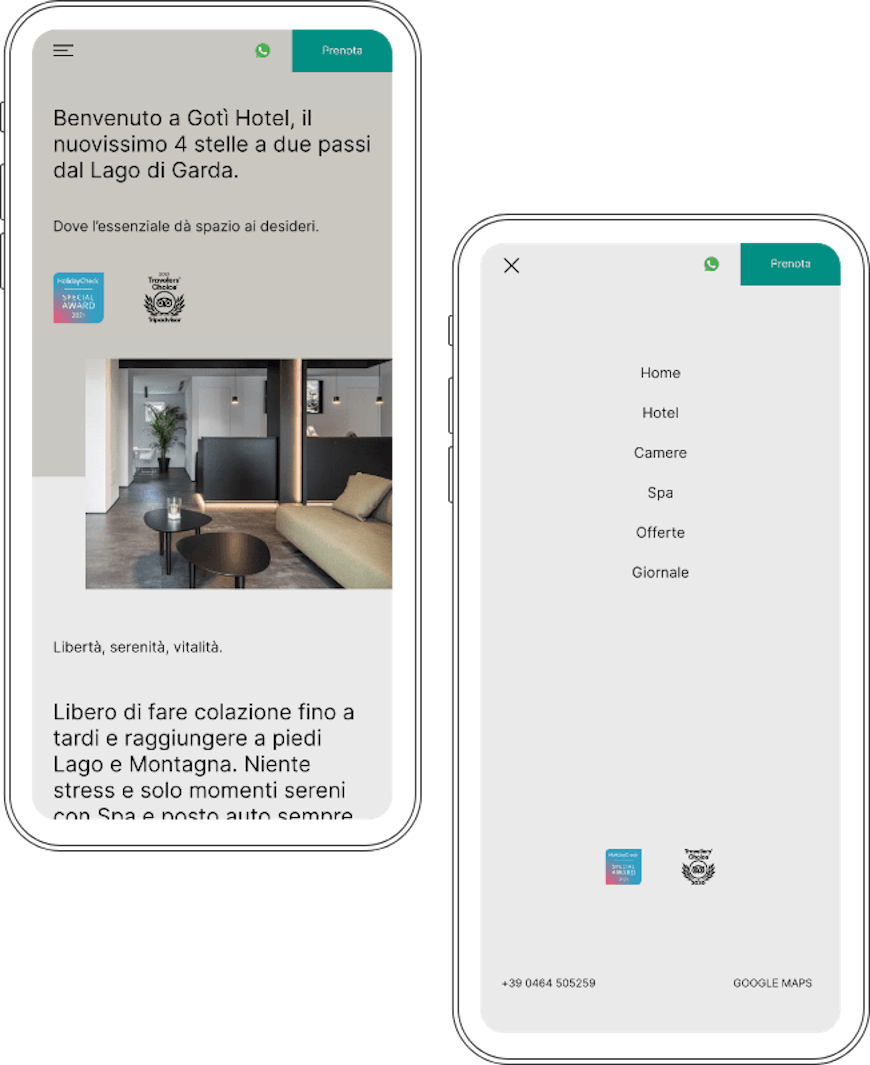È stato progettato un layout per le diverse esigenze della navigazione da mobile, mettendo in evidenza alcuni elementi chiave come il rimando diretto a whatsapp e a google maps, in modo da semplificare e velocizzare prenotazione, geolocalizzazione e fruizione generale dei contenuti.