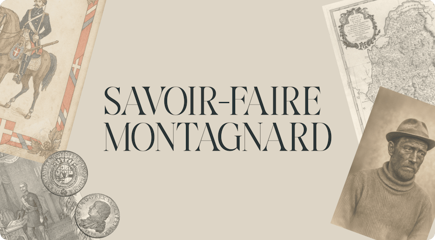 Per raccontare la tradizione savoiarda e l’immaginario alpino, abbiamo costruito una serie di illustrazioni dal gusto Belle Époque, ottenute combinando fotografie vintage e layer illustrati con texture materiche.