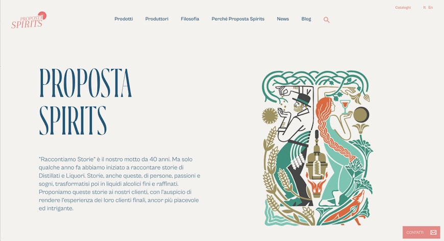 L’identità di Proposta Spirits nasce in continuità con la scelta fatta per Proposta Vini di adottare un linguaggio illustrato, più distintivo e memorabile rispetto a quello fotografico. La ricerca di stile si è quindi orientata verso un tratto illustrativo vintage ma contemporaneo, meno formale rispetto al mondo vino e più vicino all’immaginario dinamico e sofisticato della mixology contemporanea.
